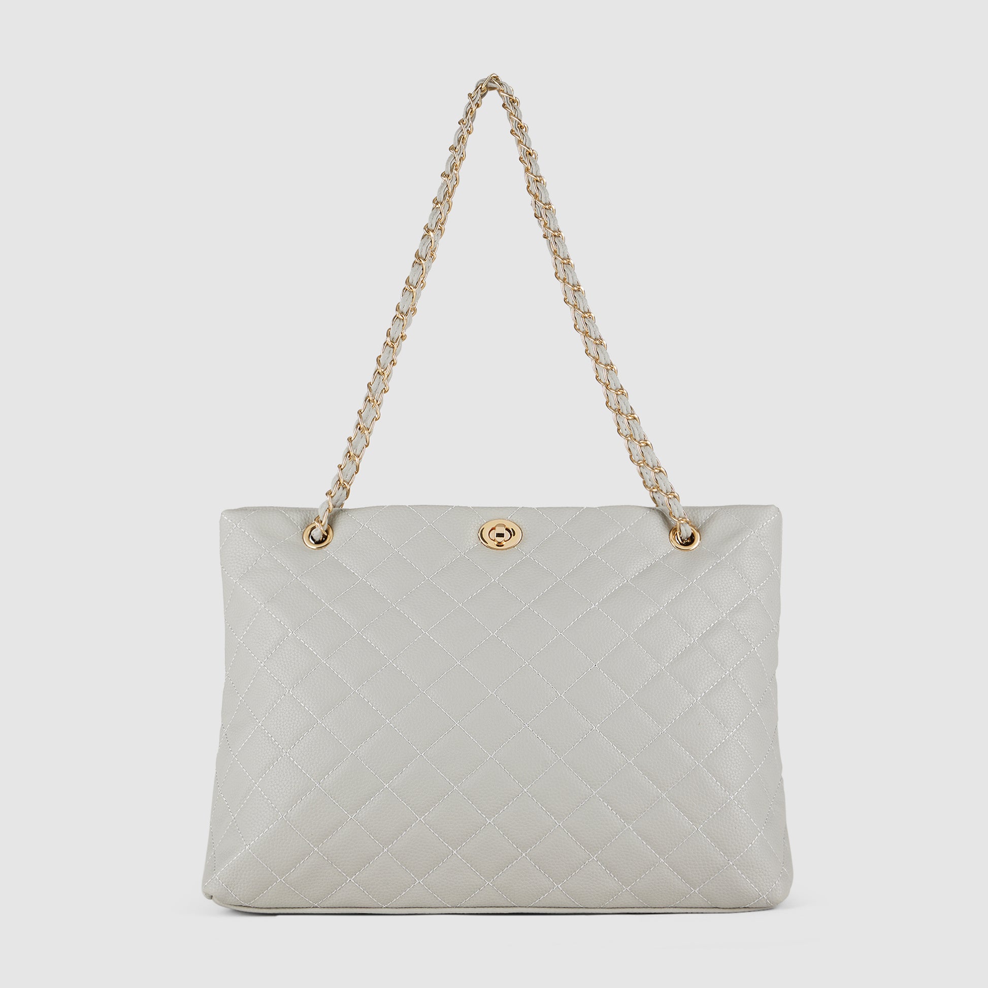 Add a timeless accessory to your collection with our luxurious quilted Kylie shoulder bag. Crafted from premium PU leather in an elegant grey hue, it features a classic quilted pattern that exudes sophistication. The gold-tone chain straps, interwoven with matching leather, offer a perfect blend of style and functionality. Designed with a secure turn-lock closure, this spacious bag is ideal for carrying your essentials while maintaining a chic look. Perfect for work, shopping, or evening outings, this bag is a versatile addition to any wardrobe.