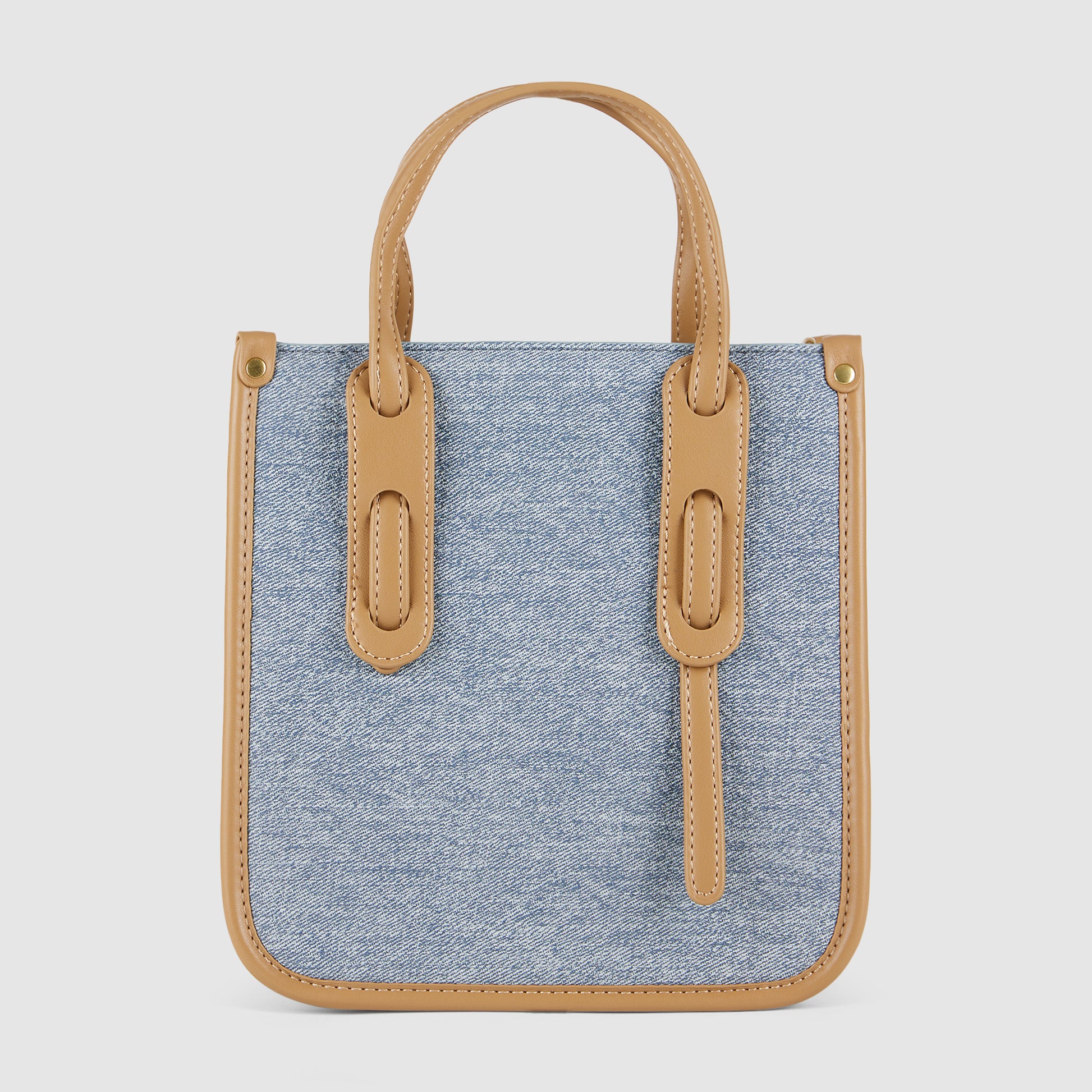 Upgrade your accessory collection with our stylish two-tone mini Bella tote crossbody bag. Combining a clean denim canvas body with tan PU leather accents, this bag is perfect for fashion-forward individuals. The structured silhouette and elegant design make it a versatile piece for both casual and semi-formal occasions. It features dual top handles and a detachable crossbody strap with a trendy chain detail, allowing you to style it your way. Compact yet spacious enough for your daily essentials, this bag is a must-have for effortless chic.
