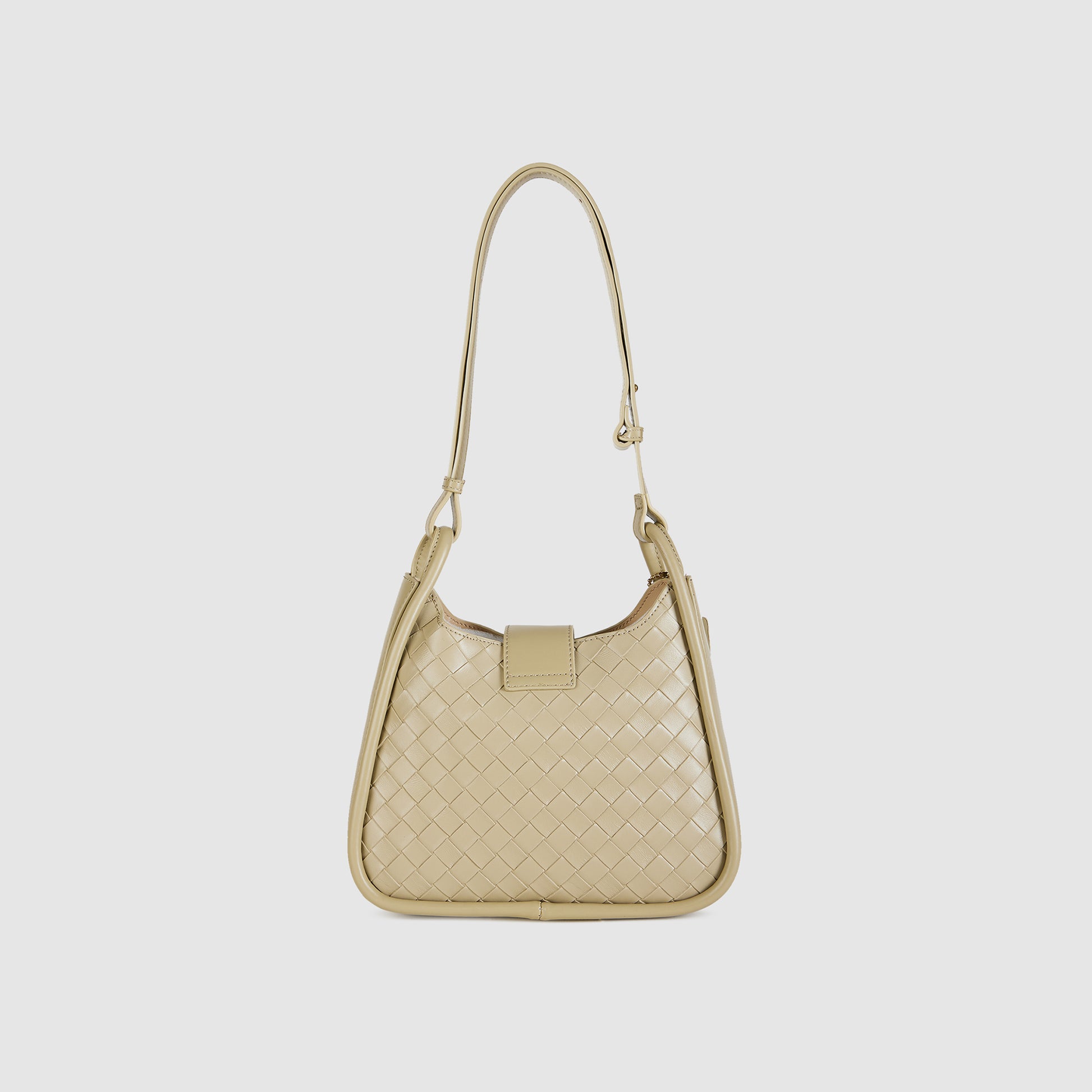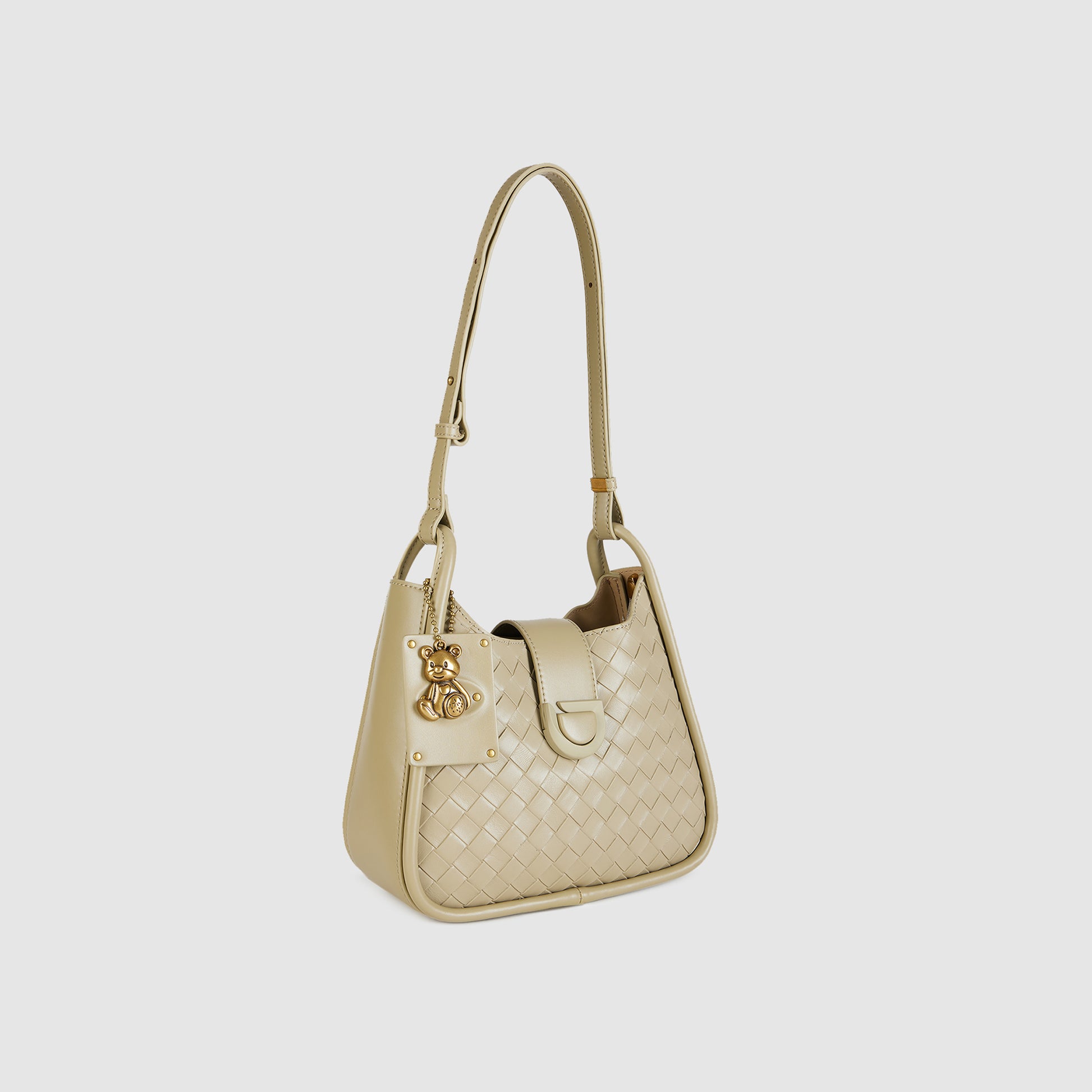 Our Sofia Shoulder Bag is perfect for daily use or special occasions. It features a woven beige body with matching PU leather trims and gold-tone accents for a sophisticated yet playful design. The design includes a flap closure secured with a gold-tone D-ring clasp. A charming bear-shaped gold embellishment is attached to a PU leather tag on the side, adding a playful yet luxurious detail. The adjustable strap allows for comfortable wear on the shoulder or as a crossbody.