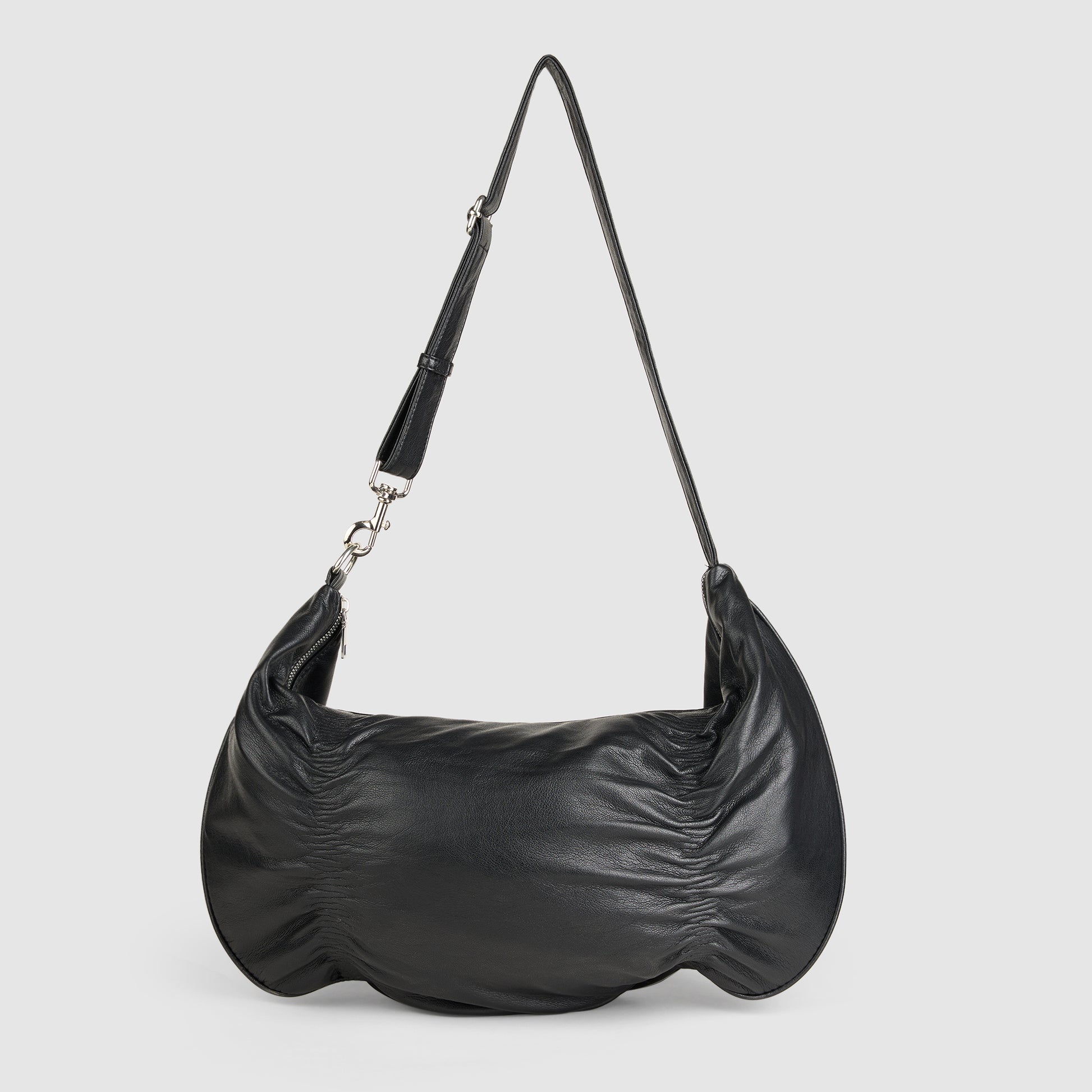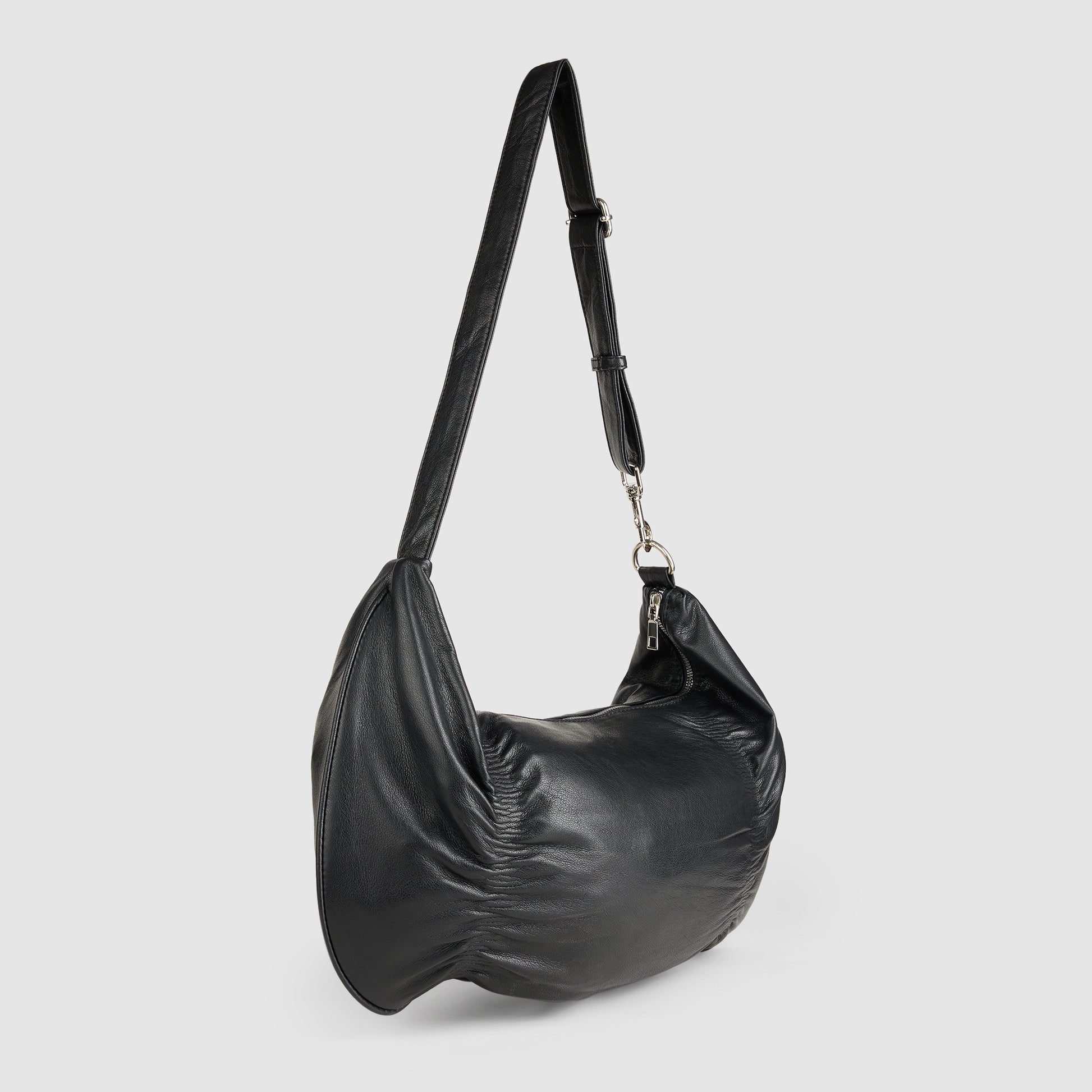 Our Kiara contemporary crescent-shaped travel bag combines minimalism with soft, relaxed structure. Its supremely lightweight & so soft. Crafted from smooth black PU leather with a slightly ruched texture, it offers a chic and casual style.. The bag features a detachable, adjustable strap with silver-tone hardware, allowing versatility as a shoulder or crossbody bag. A secure top zipper closure keeps essentials safe, while the spacious, unlined interior provides ample room for daily necessities. Perfect for everyday wear, it effortlessly complements both relaxed and polished looks.