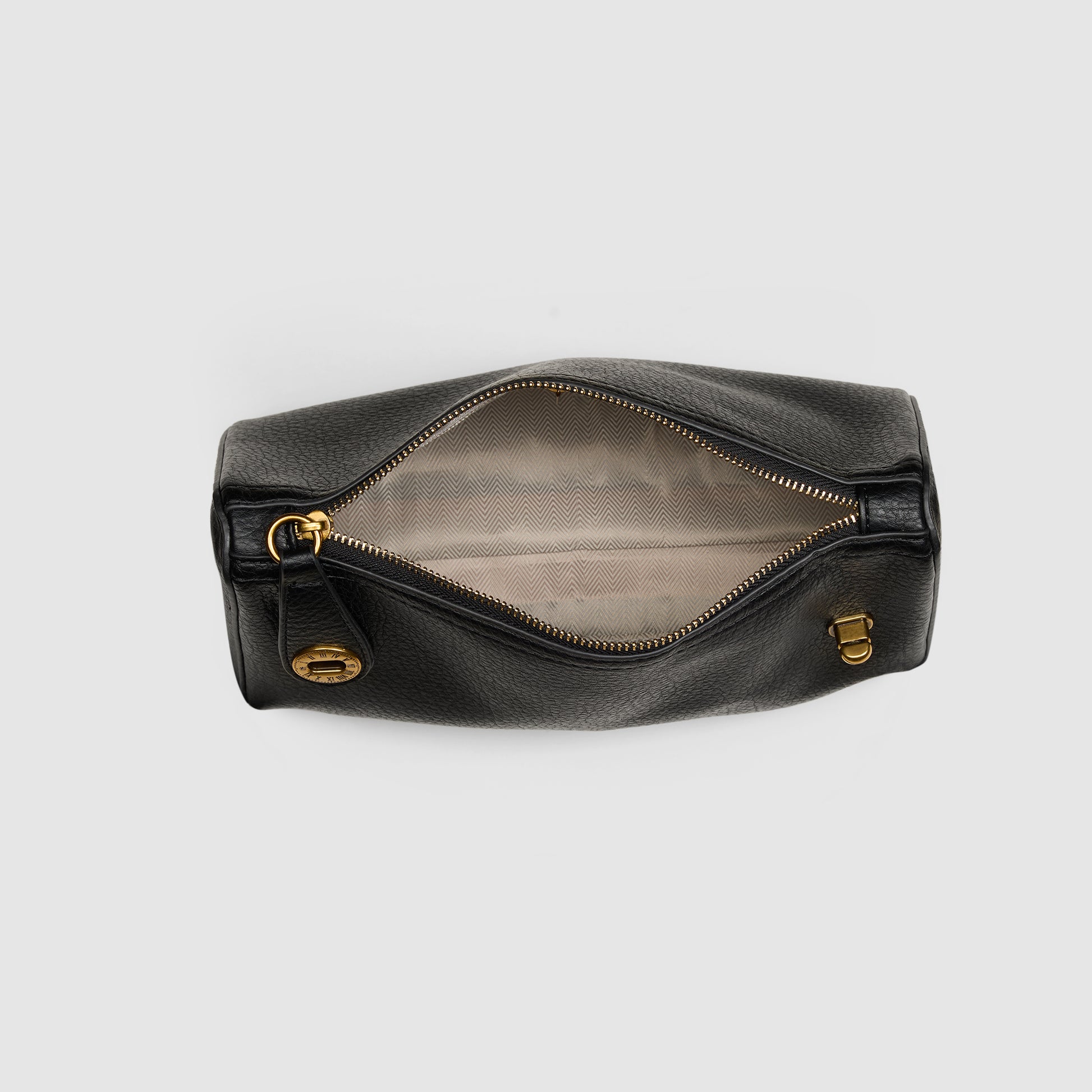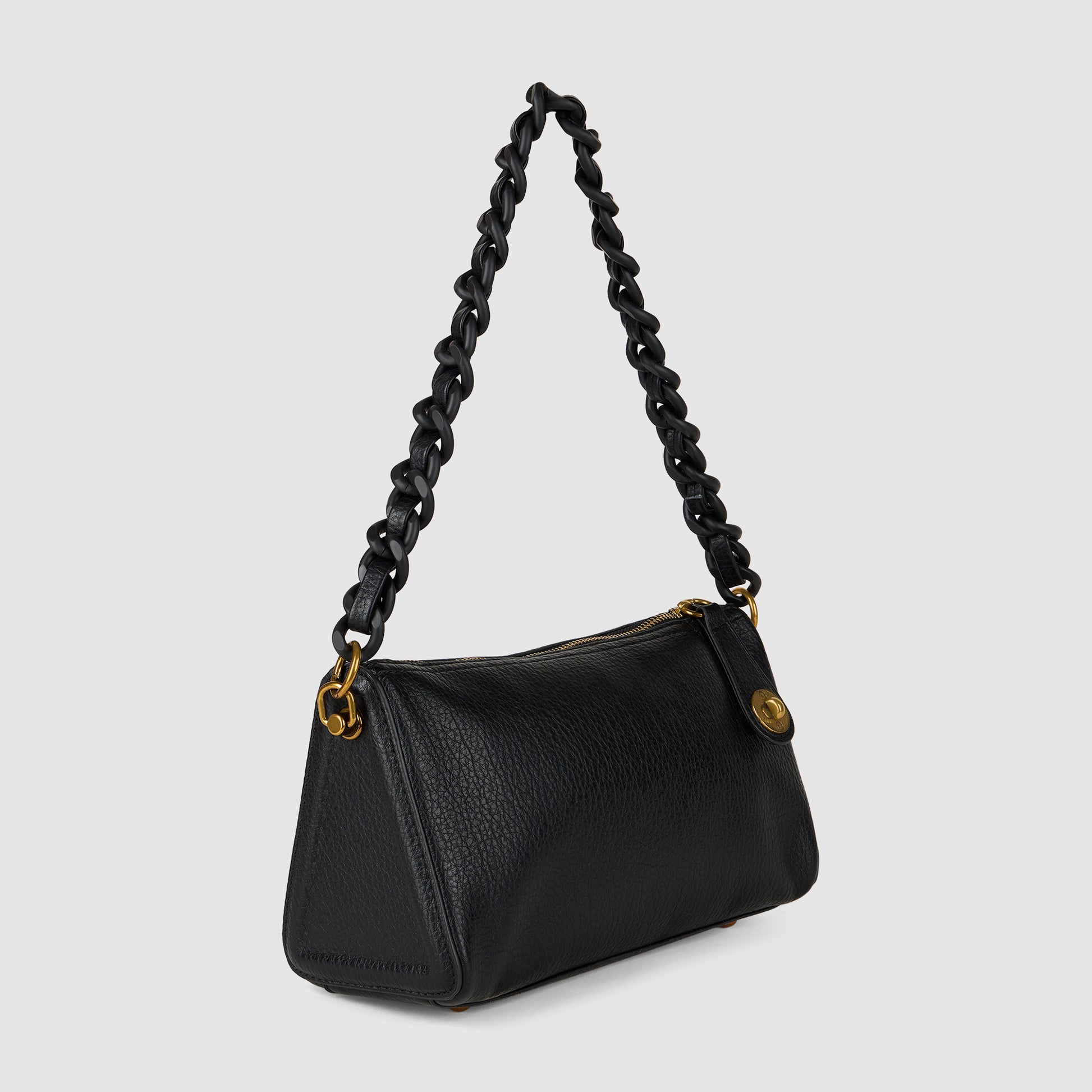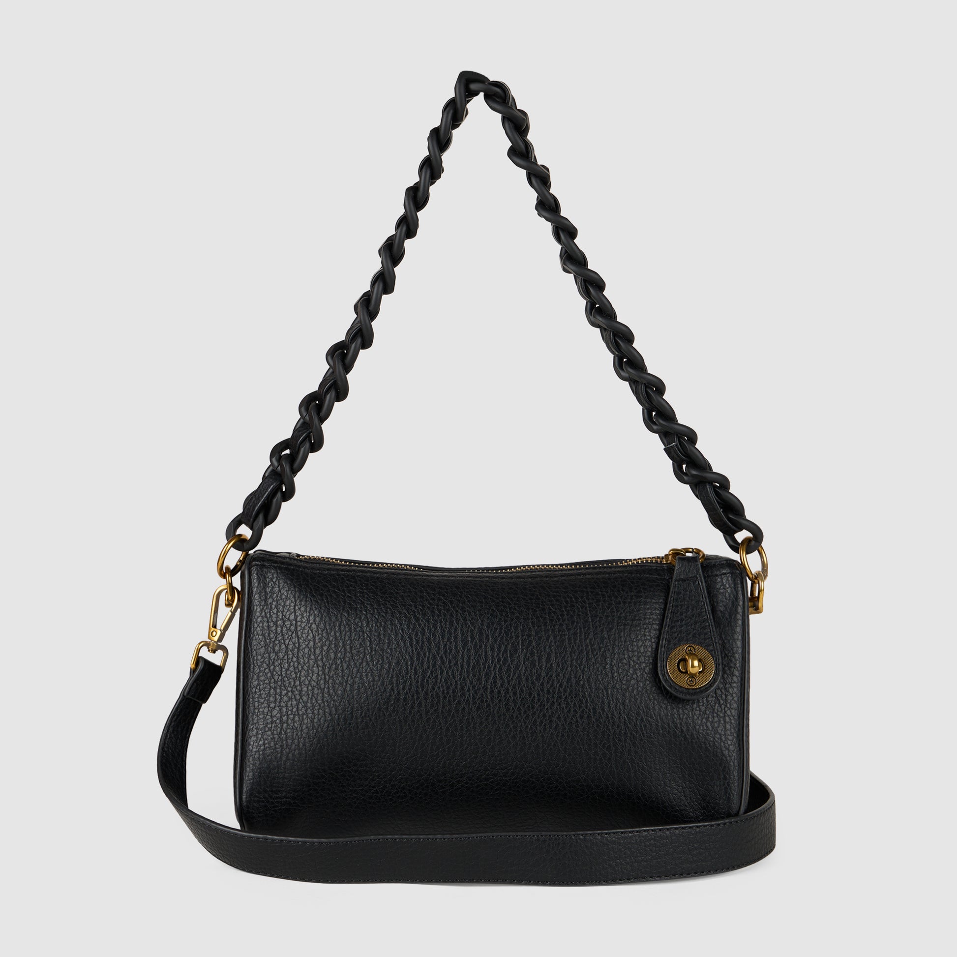 Our Adele Shoulder Bag is crafted from high-quality faux leather in a rich black tone. It features a classic rectangular silhouette with a pebbled texture for a touch of sophistication. The bag comes with a zippered top closure to keep your essentials secure. It includes a trendy braided chain handle for a modern aesthetic, complemented by a fully adjustable and removable crossbody strap for multi-functional wear. The gold-tone hardware accents, including a decorative turn-lock detail, add an elegant finish to this everyday accessory.