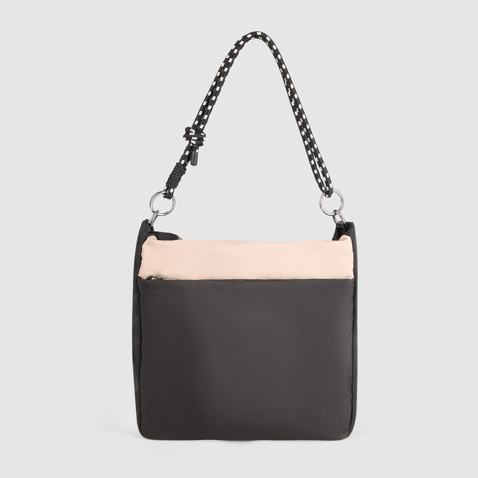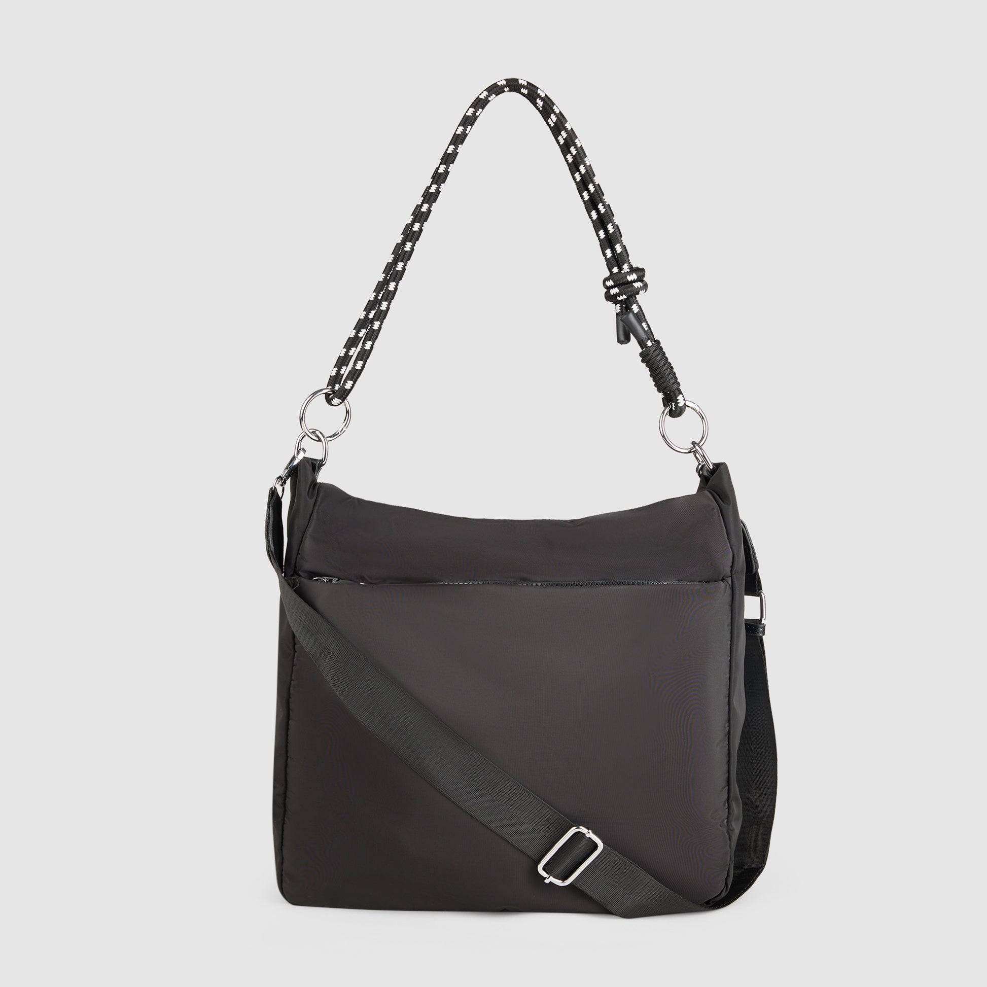Our Ari Travel bag combines functionality with unique design elements. Made from lightweight, durable nylon in a black tone with grey accents, it offers a spacious main compartment secured by a zip closure. The standout feature is a vibrant, multicolored rope handle with geometric patterns, adding a playful, modern twist. An adjustable, detachable black crossbody strap provides versatility for hands-free wear. The bag also includes an exterior slip pocket for quick access to essentials. Silver-tone hardware and circular rings complete the fresh, sporty aesthetic, making it perfect for casual outings or everyday use.