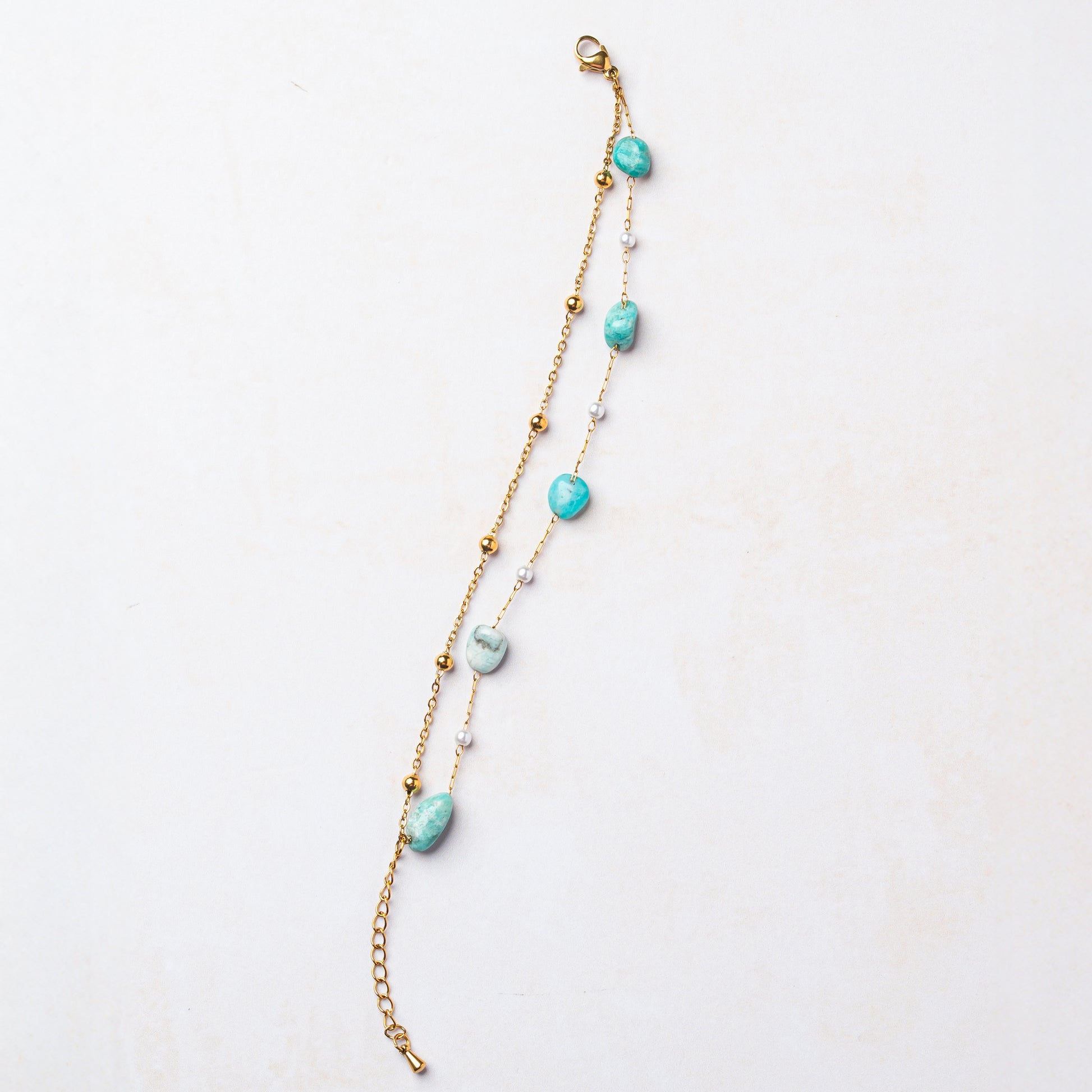 Infused with serene beach vibes, this bracelet features turquoise-toned gemstones and gold beads on a delicate chain. A playful yet elegant addition to your summer stack, bringing a pop of color and calm to your wrist.