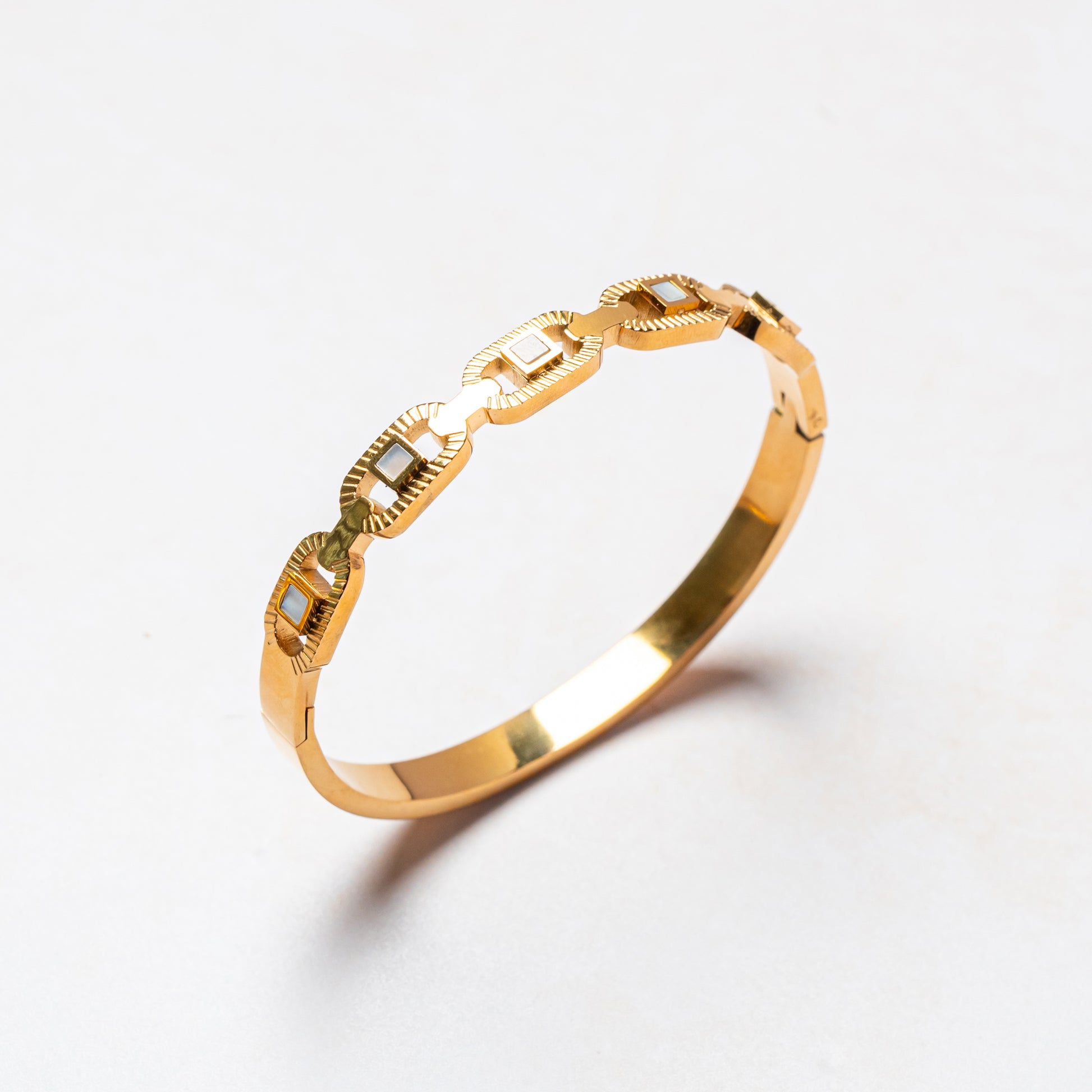 A tribute to bold femininity, this bangle features interlocking chain-like motifs with raised texture. Securely fastened and richly plated, it blends strength with sophistication.