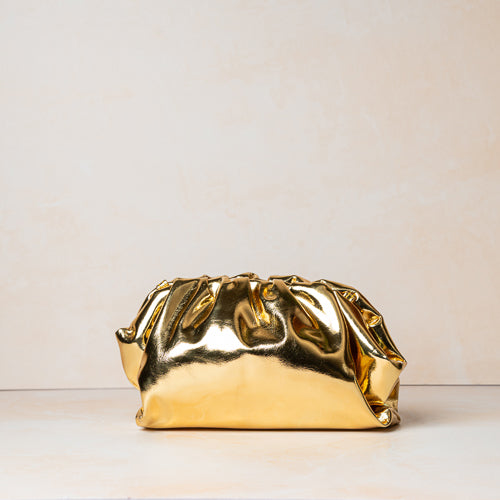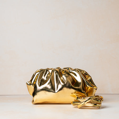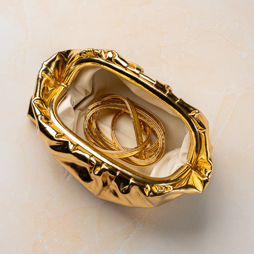 The supple structure allows the bag to comfortably hold your essentials while maintaining its fluid shape. Designed for versatility, this clutch comes with a matching gold adjustable strap, allowing it to be styled as a clutch, shoulder bag, or crossbody—perfect for seamless day-to-night transitions.