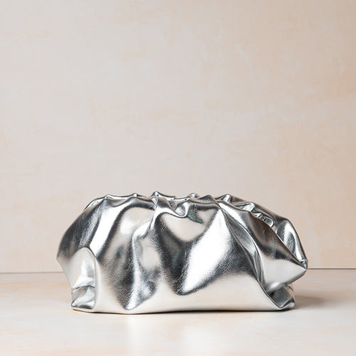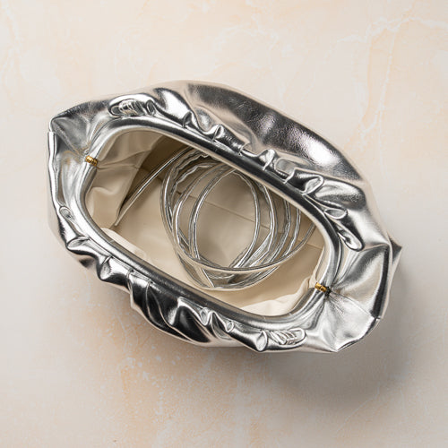 Bold, glamorous, and effortlessly statement-making, the Leona Metallic Silver Ruched Clutch Bag is designed to elevate evening looks and special occasions. Crafted in a high-shine metallic silver finish, the soft ruched silhouette creates a sculptural, contemporary form that stands out with understated drama.