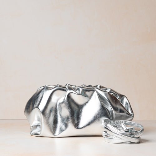 Bold, glamorous, and effortlessly statement-making, the Leona Metallic Silver Ruched Clutch Bag is designed to elevate evening looks and special occasions. Crafted in a high-shine metallic silver finish, the soft ruched silhouette creates a sculptural, contemporary form that stands out with understated drama.