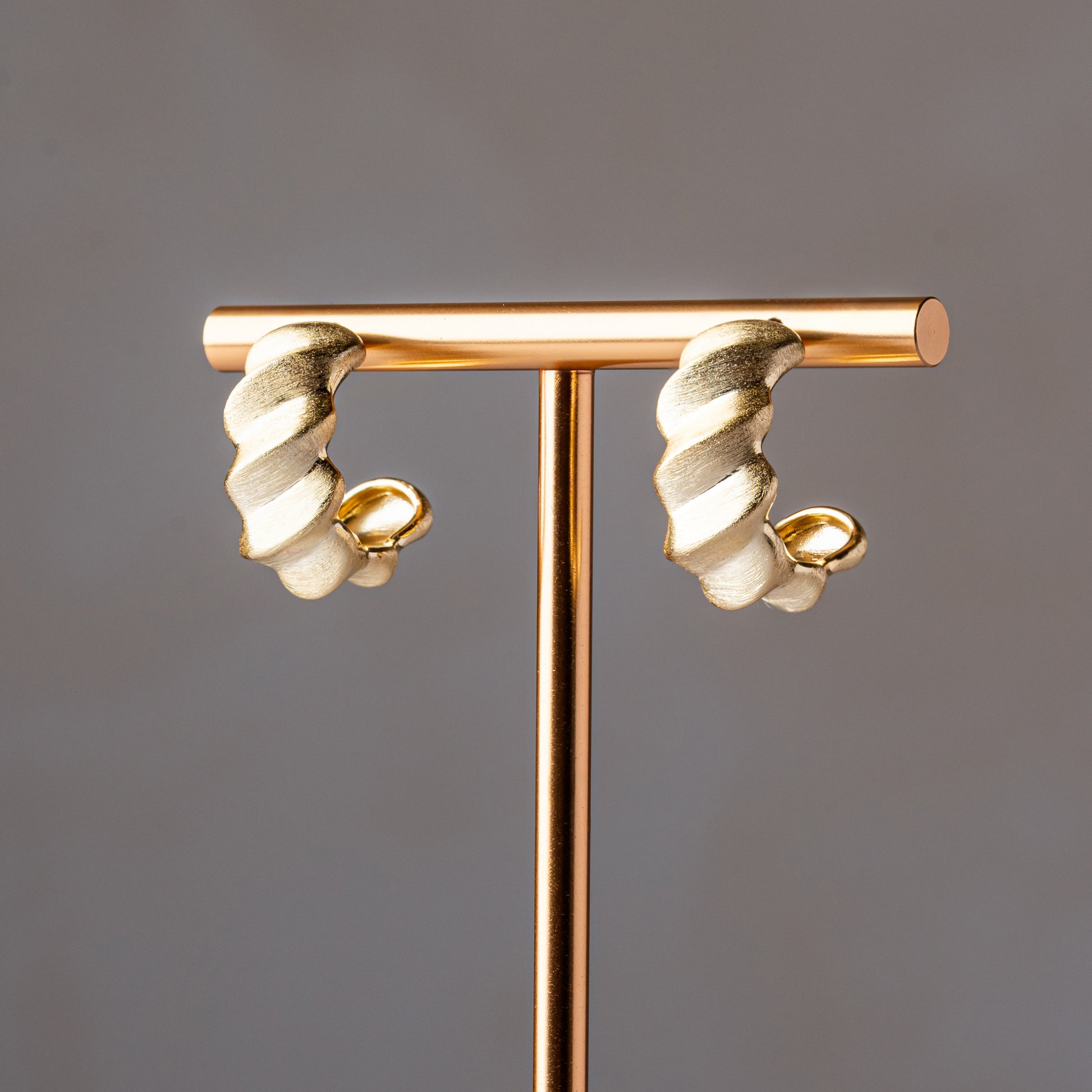 Sculpted like twisted ribbon, these matte gold hoops offer modern texture with an edge. Bold yet lightweight, they bring a soft shimmer to your everyday style.