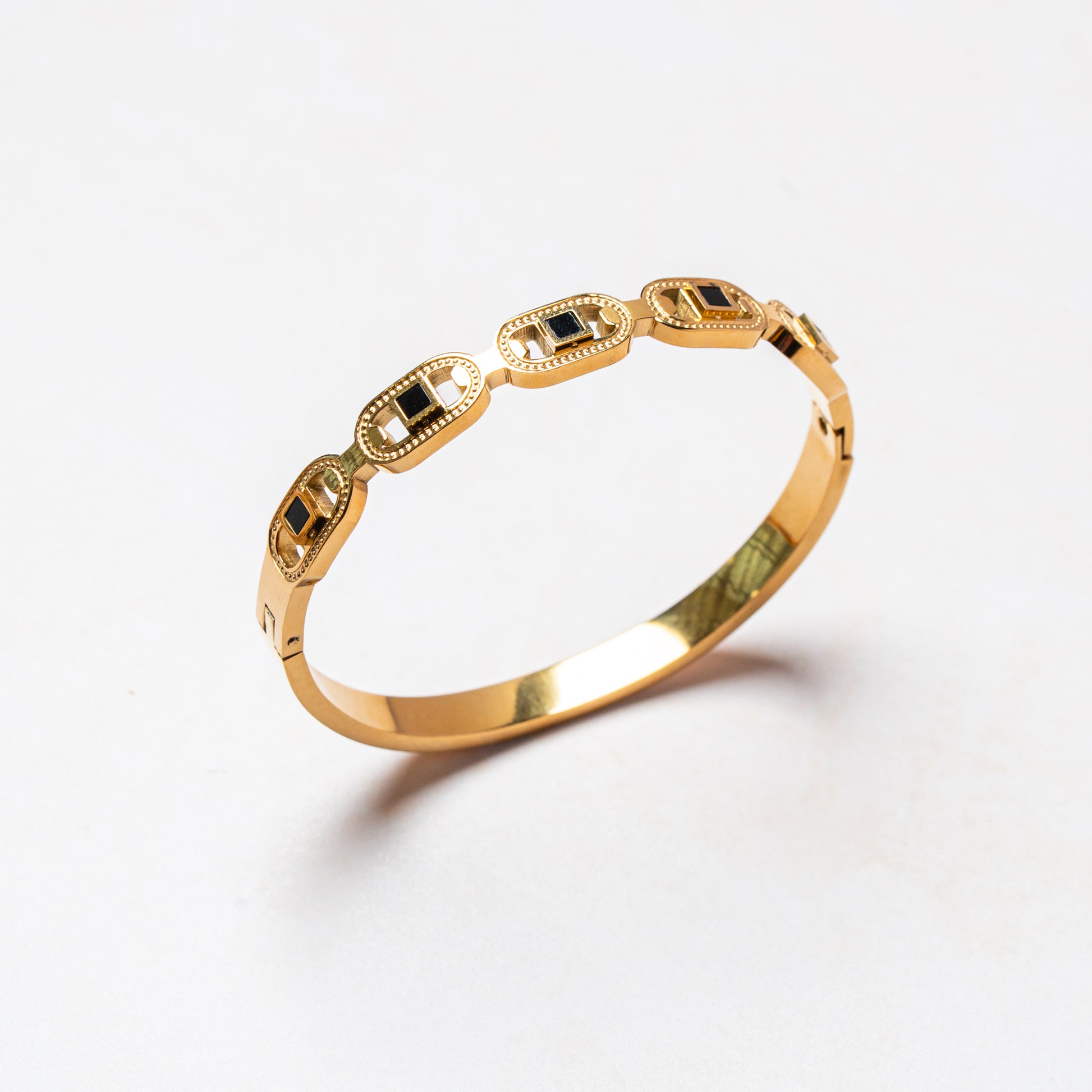 A tribute to bold femininity, this bangle features interlocking chain-like motifs with raised texture. Securely fastened and richly plated, it blends strength with sophistication.