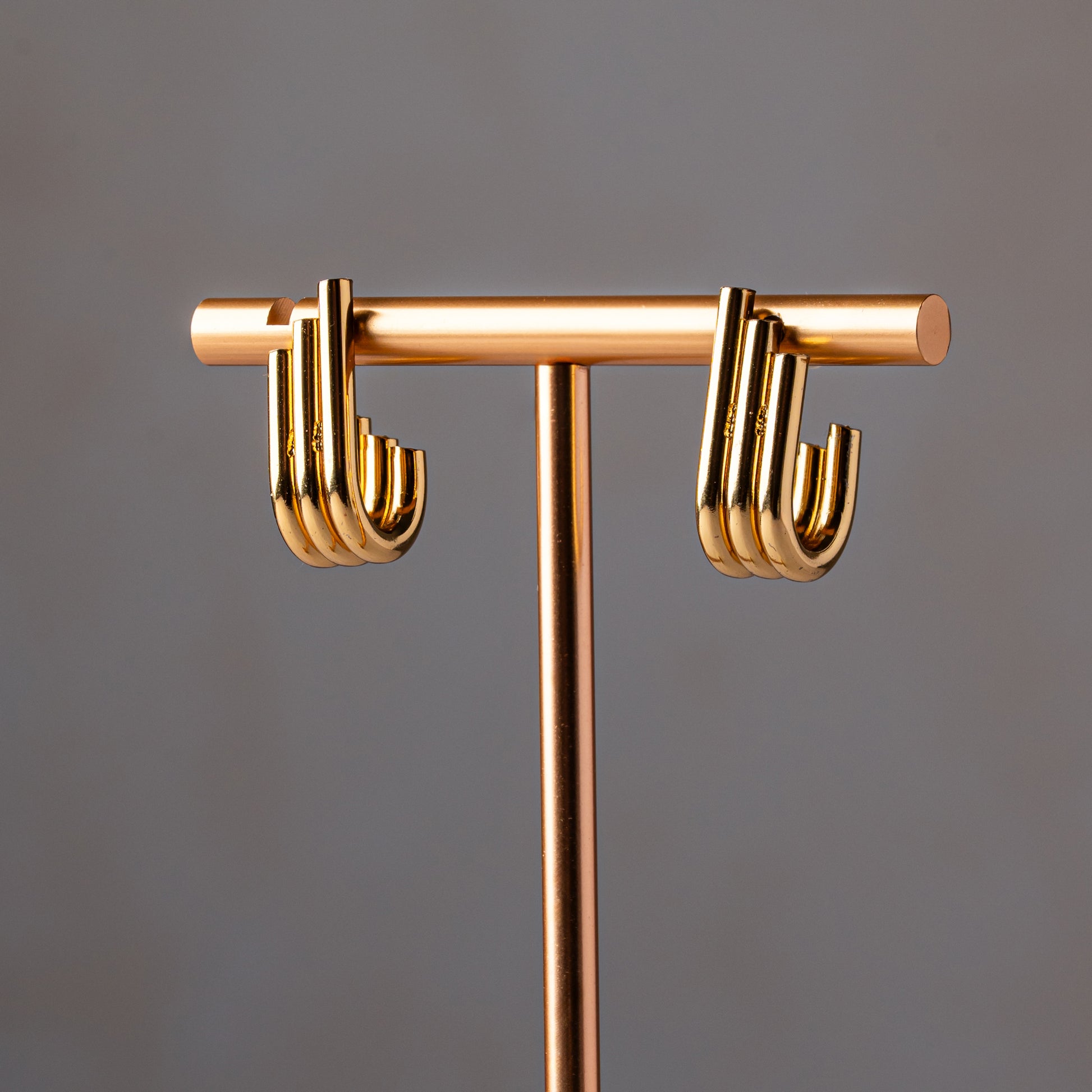 Minimalist yet powerful, these structured gold hoops feature layered arcs that create a bold and edgy silhouette. A statement piece for the modern muse.