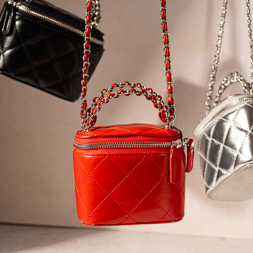 Available in classic red, black, and silver, this mini bag transitions seamlessly from casual chic to evening glam.