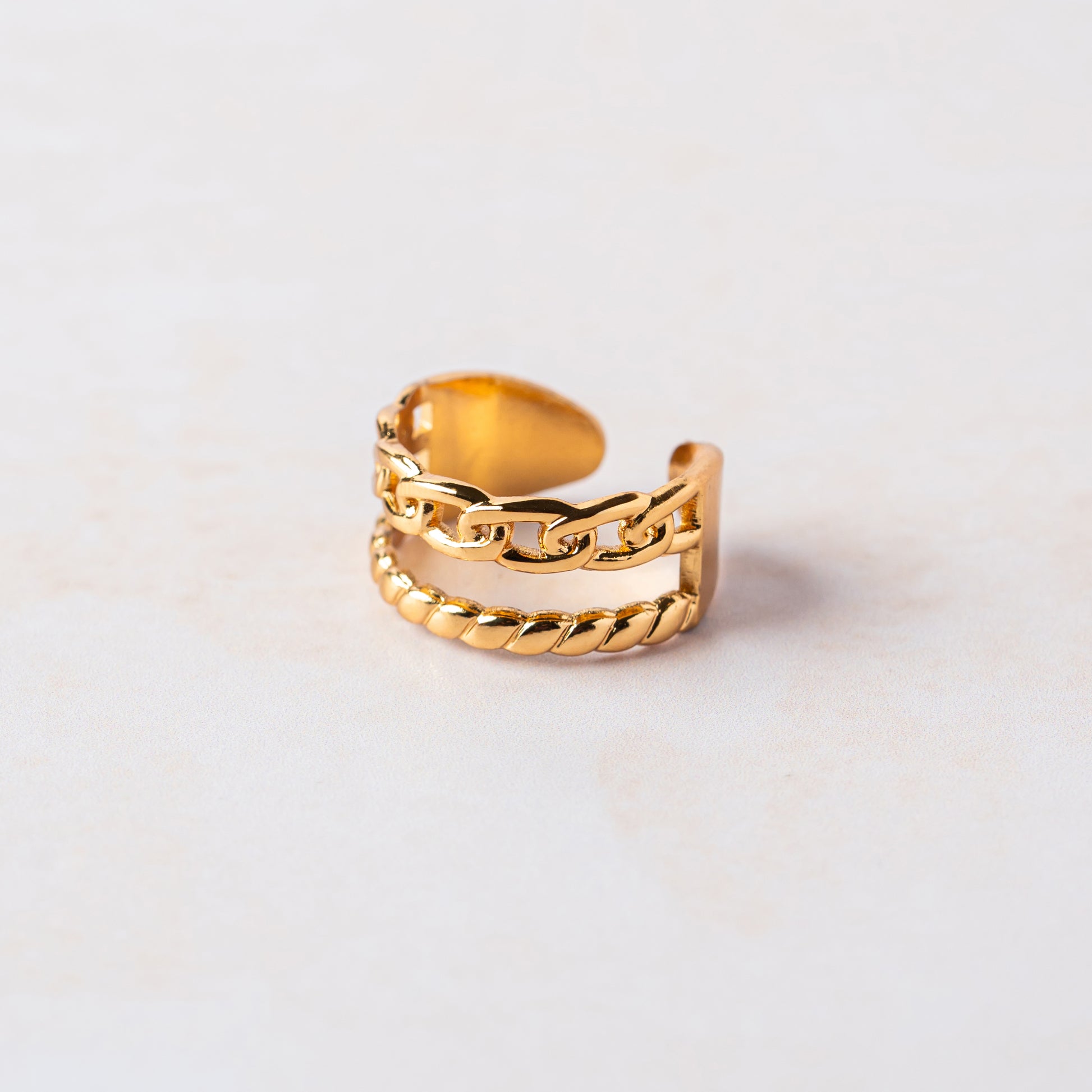 With a stylish mix of flat and rope-style chains, this ring brings edgy layering in one piece. A modern must-have.