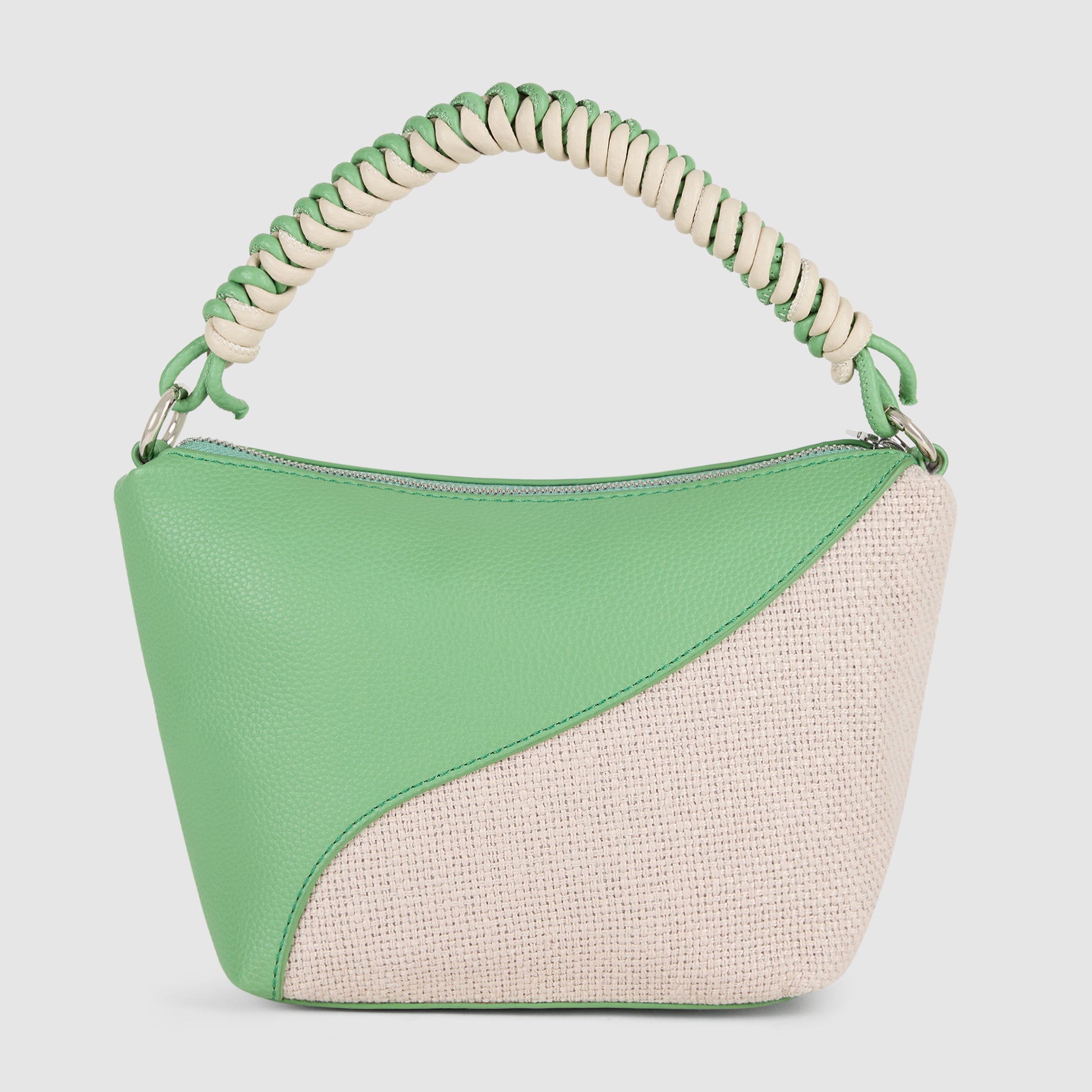 Add a fresh pop of color to your wardrobe with this unique pink Savanna Handbag, designed with a blend of textures and materials for a modern yet natural look. The bag features a two-tone design, combining smooth faux leather in vibrant green with beige woven fabric for a striking contrast. A decorative braided detail along the top edge enhances its stylish appeal. The adjustable and detachable strap allows for versatile carrying as a handbad or crossbody bag. A secure zipper closure keeps your essentials safe, making it perfect for both casual outings and summer getaways.