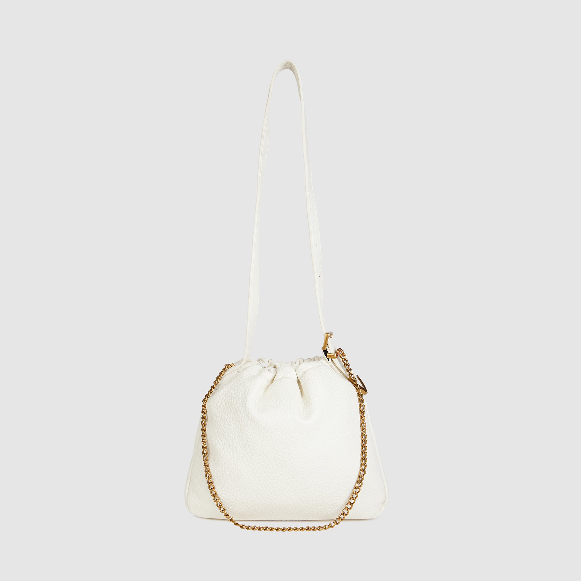 Our elegant and minimalist Sienna Shoulder Bag is crafted from high-quality white textured leather, making it a timeless accessory for any outfit. The bag features a unique drawstring closure that adds a casual yet sophisticated charm. The gold-tone chain provides a versatile styling option, serving as either a decorative accent or a secondary strap. Its adjustable leather shoulder strap ensures a perfect fit, making it a practical and stylish choice for everyday wear or special occasions.